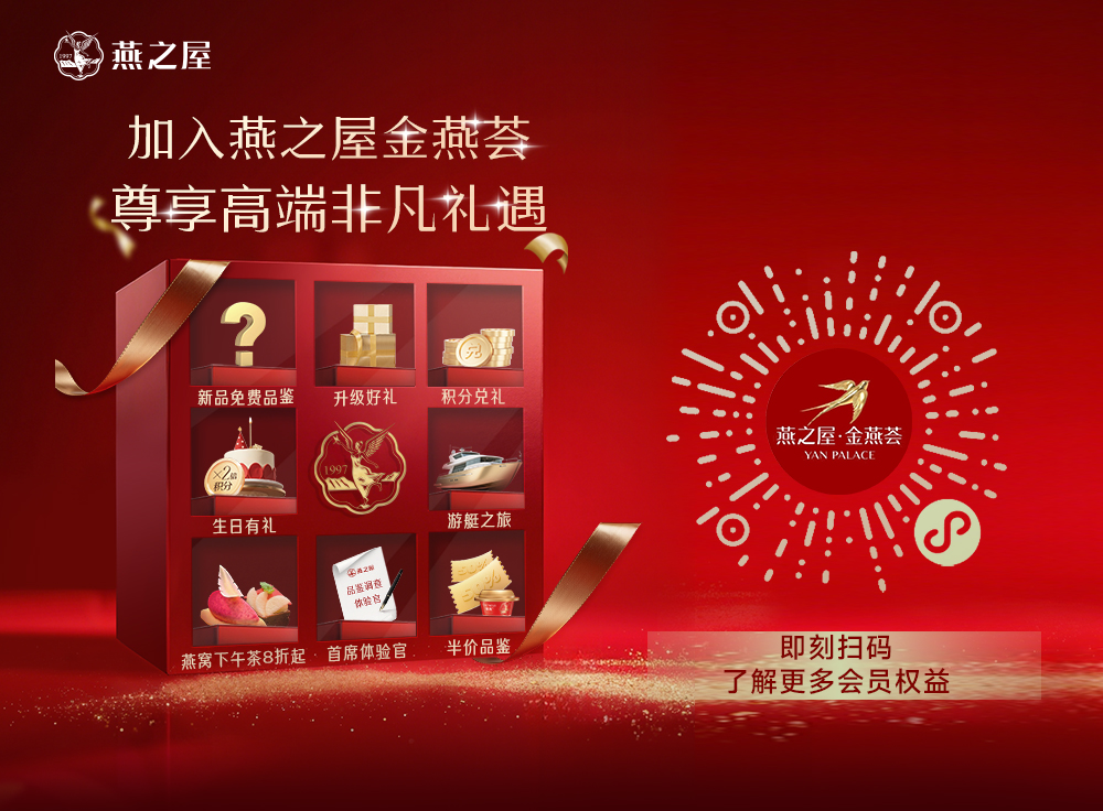 即刻掃碼,加入燕之屋金燕薈,開(kāi)啟高端品質(zhì)生活,為您定制更多專(zhuān)寵禮遇,享受專(zhuān)屬的尊貴體驗。