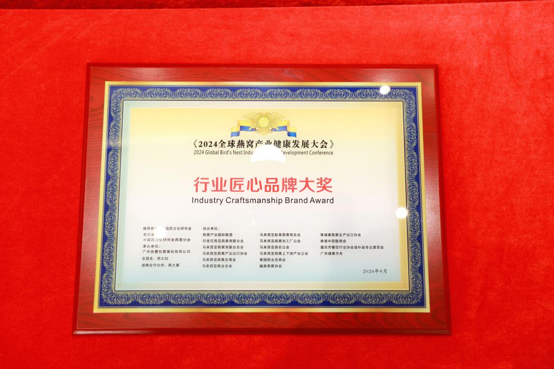 9月23日,在榜樣的力量一行業(yè)表彰盛典上,燕之屋憑借先進(jìn)的創(chuàng )新引領(lǐng)力、卓越的產(chǎn)品競爭力、強勁的品牌影響力榮獲行業(yè)領(lǐng)軍品牌大獎、行業(yè)匠心品牌大獎、技術(shù)創(chuàng )新大獎,燕之屋創(chuàng )始人、執行董事兼董事長(cháng)黃健榮獲行業(yè)領(lǐng)軍人物;燕之屋傾情助力2024全球燕窩產(chǎn)業(yè)健康發(fā)展大會(huì ),進(jìn)一步推動(dòng)燕窩產(chǎn)業(yè)的創(chuàng )新發(fā)展,促進(jìn)燕窩文化的傳承與交流,為行業(yè)的繁榮貢獻力量,獲頒《2024全球燕窩產(chǎn)業(yè)健康發(fā)展大會(huì )》戰略合作單位,并成為《2024全球燕窩產(chǎn)業(yè)健康發(fā)展大會(huì )》唯一指定碗燕即食燕窩品牌,燕之屋公關(guān)總監楊航上臺領(lǐng)獎。