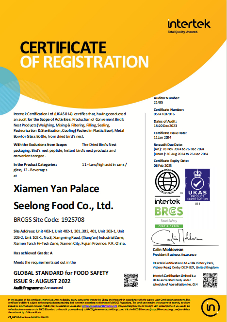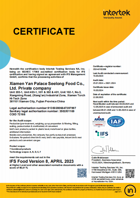 為了響應美國官方的高標準要求,燕之屋分別通過(guò)了HACCP食品管理體系認證、BRC全球食品安全標準認證、IFS國際卓越標準認證和食品出口備案資質(zhì),參加了美國FDA指定的由中國檢驗檢疫科學(xué)院舉辦的BSPC培訓,并順利通過(guò)考核獲得出口資格,通過(guò)了FDA、FCE、SID注冊。此外,燕之屋更主動(dòng)將產(chǎn)品送至權威檢測機構SGS,152項指標檢測全部合格通過(guò),印證燕之屋卓越產(chǎn)品力。2024年10月25日,燕之屋在廈門(mén)海關(guān)系統報檢通關(guān)。之后,燕之屋旗下高品質(zhì)燕窩產(chǎn)品冰糖官燕(60gx6、60gx12)、碗燕·禧孕款(80gx3)、碗燕·尊享款(158gx6)、碗燕·甄愛(ài)款(108gx6)、碗燕·濃鮮款(138gx10)通過(guò)美國食品藥品管理局(FDA)審批,順利運抵紐約,正式上架開(kāi)售,為當地消費者帶來(lái)來(lái)自中國的高端尊貴滋養。